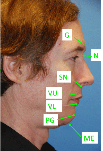Chin implants (Dr Young specializes in plastic surgery in the Face and Neck in Bellevue Washington) come in many shapes and sizes.  Sometimes, even with the many variations there  might not be one that fits all of your needs.  This is when a custom implant may be the perfect choice for you.  One of the first questions you should ask is whether or not a chin implant would work for you.  There are multiple ways of assessing whether you could benefit from enhancing your chin.  The first thing to do is to understand the various landmarks. In the first picture, the Glabella, labelled “G” is the most projecting point on the lower parto f the forehead and is usually right between the eyebrows. The nasion, labeled “N”, is the most depressed point below G and is usually at the root of the nose.  The Subnasale, labeled “SN”, is the point of transition from the nose to the upper lip.  It is where the nose, columnella, intersects the upper lip.  The upper vermillion is the point of transition from the white part of the upper lip to the red portion of the lip (Called the Vermillion) and is labeled “VU”. The same point coinciding with the lower lip is labeled “VL”. The Pogonion, labeled “PG”, is the point of the chin that is the most projecting anteriorly.  The mentum, labeled “MN”, is the most inferior portion of the chin.  One thing to be careful of is when the patient has a double chin.  The mentum is the part of the chin that is associated with the chin and not the inferior part of the sagging that can occur under the chin and posterior to the chin. One rule was developed by Gonzalez-Ulloa shown in the second picture.  The horizontal line you see will be refered to a lot by surgeons. It is called the frankfort horizontal.  It travels from the top of the ear canal and through the top of the inferior orbital rim.  The vertical line you see is part of there interpretation of where the chin should be.  The vertical line should travel through the Nasion and the the Pogonion should approximate this line. Some feel that the augmentation based on this rule would lead to too much projection. A similar rule places the vertical line of the Gonzalez-Ulloa line more posteriorly at the subnasale, although sometimes it is very close as in this picture, called the Epker and Fish Rule.  Based on this rule, the vertical line should travel from the subnasale and through the upper vermillion “VU” and the lower vermillion should be 2mm behind, and the pogonion should be 4mm behind. The third really common rule is based on the Nasal Chin Lip Line.  It is based on the ideal nasal length measure from the root of the nose at the level between the upper eyelid crease and the upper eyelid margin to the nasal tip.  From the half point distance, a line is drawn through the upper lip vermillion.  From this point, the pogonion should be be 3mm behind this line.  The last two rules are my most preferred ways to assess how much chin augmentation to do.  In another blog, I will address the vertical dimensional analysis.